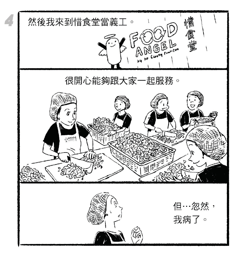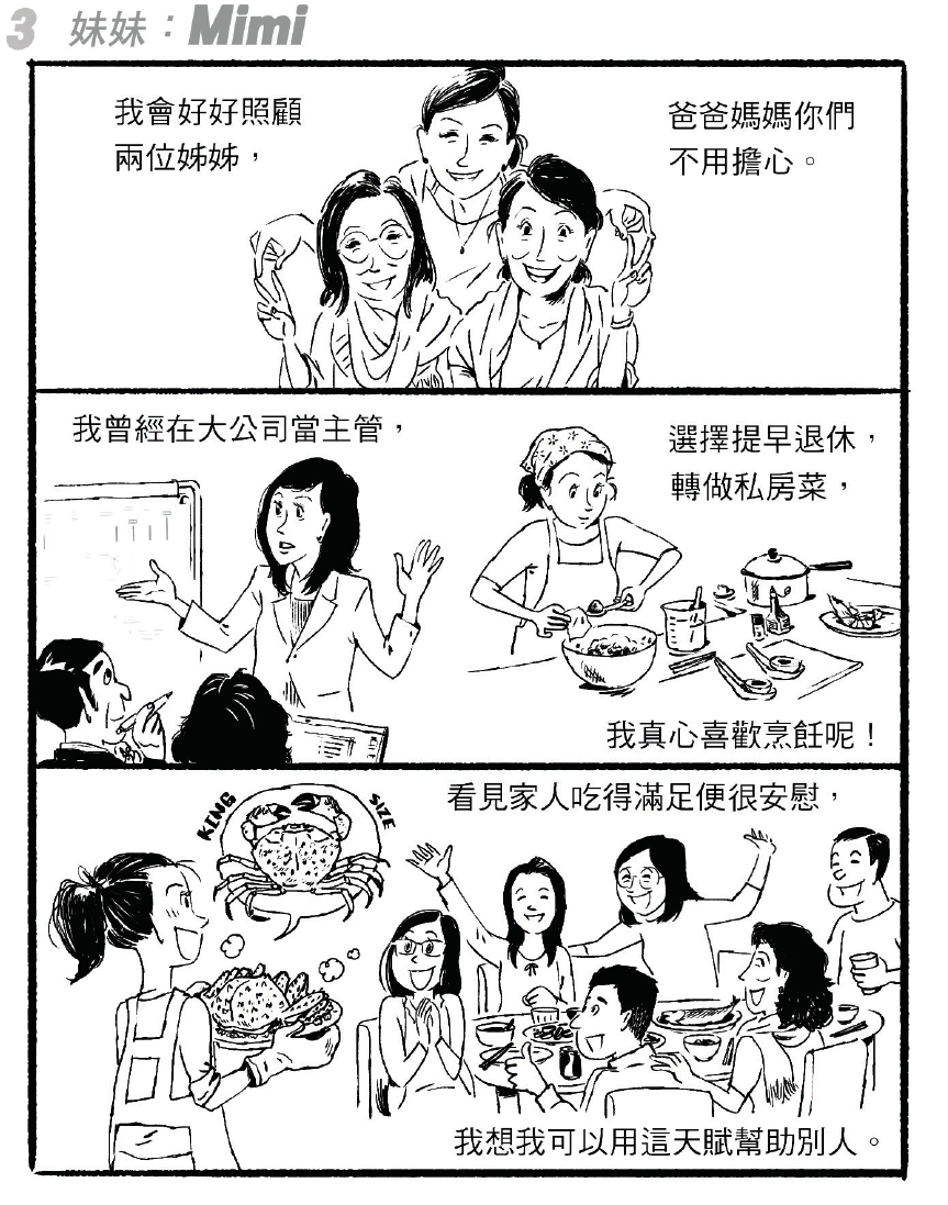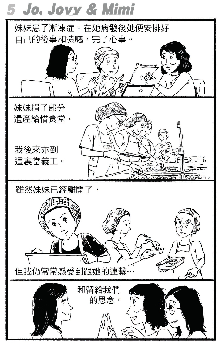 姊妹仨的爸爸和媽媽,分別在她們20多歲和近40歲時上天堂,正好是三人事業拚搏一輪過後,重歸親密的時機。Jo說Mimi擔起媽媽的角色,Jovy想起Mimi在家庭聚會炮製的「超大隻的蟹」,仍然興奮。製作美食之餘,Mimi到惜食堂的食物工場做義工,在沒冷氣的廚房內切菜或裝飯。或是美食和照顧別人貫穿Mimi的一生,她指定遺囑中部分款項要捐給惜食堂。惜食堂告訴記者,兩年前開始有市民接觸,期望透過遺產的方式捐助,去年至今個案超過20個。同仁包括廚師,知悉Mimi曾為機構義工,以及她和家人的想法後,「感受完全不一樣,覺得我們的工作更加要做好些,真的有個託付,責任大許多」。據職員了解,一般義工如Mimi,通常到工場會幫忙篩選瓜菜、削皮、切粒,再入盒,每日為成千上萬的受眾服務。